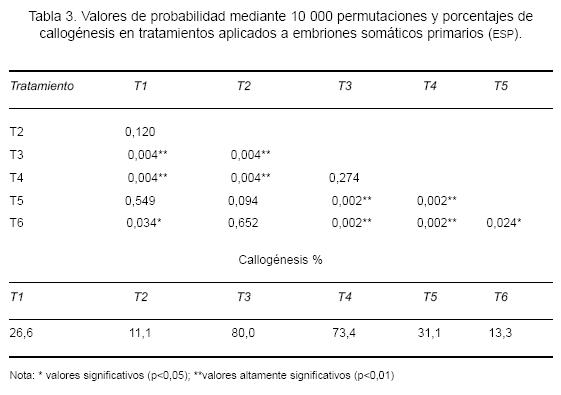 Callogénesis. Los tratamientos aplicados influenciaron significativamente la respuesta en formación de callo desde los explantos de inicio. El mayor porcentaje de formación de callo se obtuvo en el tratamiento T3 (80%) con los reguladores del crecimiento ANA y BAP a una concentración de 0,05 mgL-1 cada uno, sin otro suplemento adicional. Esta respuesta no difiere significativamente agregando 500 mgL-1 de caseína hidrolizada a estas condiciones (T4), donde 73.4% de los explantes presentaron callo (Tabla 3). Los niveles de callogénesis se presentaron significativamente inferiores a los tratamientos antes mencionados, principalmente bajo dos condiciones (Tabla 3): sin reguladores del crecimiento (con o sin caseína hidrolizada, T1 y T2) y con RC más aminoácidos (T5 y T6).
