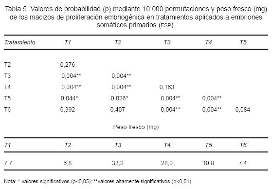 Peso fresco. El peso fresco de los agregados embriogénicos también se vio influenciado significativamente por los tratamientos. Esta variable se presentó en mayor magnitud en los tratamientos T3 y T4 (33,2 y 27,9 mg, respectivamente), sin diferencias significativas entre ambos tratamientos (p=0,163), pero sí con el resto de los tratamientos probados (Tabla 5). En los tratamientos T3 y T4 no existió una dosis adicional de aminoácidos, salvo la adición de ANA y BAP y caseína hidrolizada. Esta respuesta está influenciada tanto por la mayor presencia de callo en estos tratamientos, así como por la mayor cantidad de ESS en estado cotiledonar (Figura 1e).