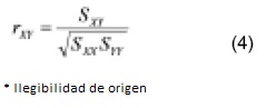 El coeficiente de aserrío real se estimó tomando en cuenta las dimensiones de las tablas a obtener: largas y cortas dimensiones, así como a los tipos de productos aserrados: tablas con albura, tablas con duramen y tablas tipo rechazo. La madera aserrada se estibó en una nave para secado al aire libre, donde se realizó un segundo conteo y cubicación para confirmar la información de los tálises de producción, ya que esta actividad se realizó tratando de no interferir en el proceso de producción. Aunque en el presente estudio no se planteó realizar la cuantificación de los subproductos del aserrío, su evaluación es importante porque son empleados como material para construcción rural, para elaborar artesanías y porque generan energía (Valerio et al., 2007). Se determinó el grado de asociación entre el volumen de madera en rollo y el volumen de madera aserrada, así como la asociación del volumen de madera en rollo y el número de piezas aserradas por día, por medio del coeficiente de correlación r con base en la siguiente expresión (Gutiérrez y De la Vara, 2008):