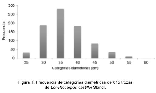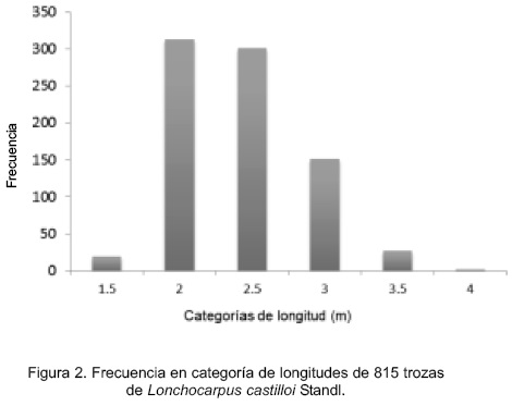 Ochenta por ciento de las trozas aserradas presentaron diámetros de 30 cm a 40 cm; y 94% presentaron longitudes de 2 m a 3 m. Los resultados de otros estudios, como el de Herrera (2008), quien también trabajó con Lonchocarpus castilloi, con diámetros de 40 cm a 70 cm y el de Valera y Salvador (2009), quienes trabajaron con Iryanthera laevis Margrak y Simarouba amara Aubl, con diámetros de 28,1 cm a 59,4 cm; son comparables con los valores dasométricos promedio de las 815 trozas en el presente trabajo. El diámetro promedio fue de 36,55 centímetros y la longitud promedio de 2,41 metros (Tabla 2).