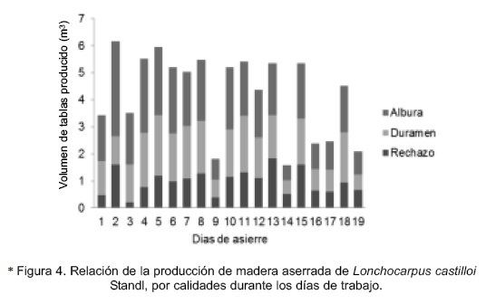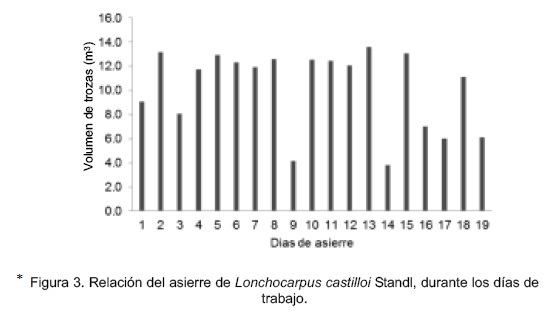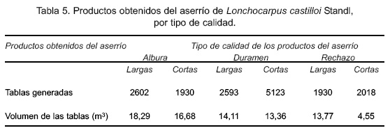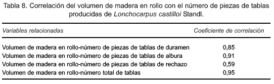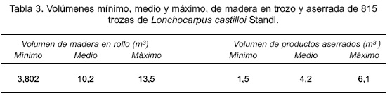 La trocería se aserró empleando el sistema de corte mixto, que es de uso tradicional. El total de las trozas del estudio, sumaron un volumen de 194,62 m3 rollo fuste sin corteza (rfsc), que al aserrarse se obtuvo un volumen 34252 pies tabla (pt). Este volumen, al ser transformado al Sistema Internacional de Unidades correspondió a 80,78 m3 de madera aserrada, resultantes de la cubicación de 19552 piezas de madera aserrada de largas y cortas dimensiones. Lo anterior indica que en este aserradero se requieren 2,45 m3 rfsc de Lonchocarpus castilloi Standl para producir un metro cúbico de madera aserrada. En la tabla 3 se presentan los valores extremos y medios de madera en rollo y productos aserrados.