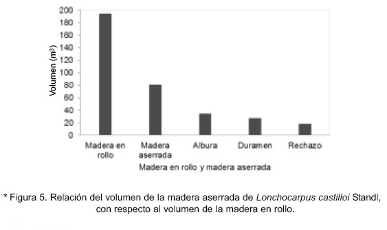 Las 815 trozas del estudio sumaron un volumen de 194,6 m3 rollo fuste sin corteza (rfsc), que al ser aserrados, proporcionaron un volumen 80,8 m3 de madera aserrada. Se requieren 2,45 m3 rfsc de Lonchocarpus castilloi Standl para producir un metro cúbico de madera aserrada.