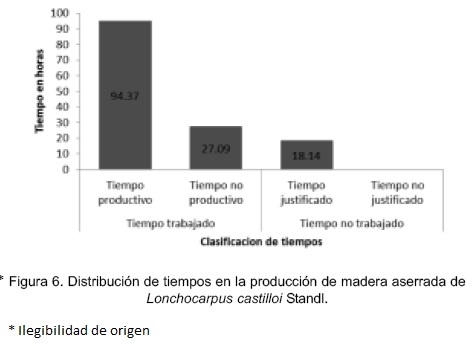 De acuerdo con los datos obtenidos del proceso de aserrado en la sierra principal, el tiempo total observado fue de 141,27 horas. Para Guillén y Chávez (1996), el tiempo trabajado productivo en la sierra principal, es considerado como el mejor indicador de la efectividad del aserradero. En el presente estudio, 68% del tiempo trabajado es productivo (94,37 horas), porcentaje que resulta similar al tiempo trabajado productivo determinado por Guillén y Chávez (1996) para el aserrado de Swietenia macrophylla (caoba) que es madera clasificada como blanda, mientras que Lonchocarpus castilloi Standl está clasificada por Bárcenas (1995) como madera dura y de difícil trabajabilidad en el aserrío. En la figura 6 se muestra la proporción de tiempos obtenidos con respecto al tiempo total observado.