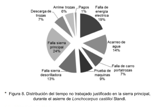 El tiempo no trabajado justificado (Fig. 8), en la sierra principal, sumó 18,14 horas (13%). Este tiempo se debió principalmente a la falta de un plan de operación anual del aserradero, y principalmente a la falta de capital para invertir en el mantenimiento del equipo de asierre. En Bolivia, Guillén y Chávez (1996) determinaron un 14,50% del tiempo no trabajado justificado para el asierre de caoba. Por su parte, León (2001) estimó 9,19% del tiempo no trabajado justificado en el aserrado de coníferas.