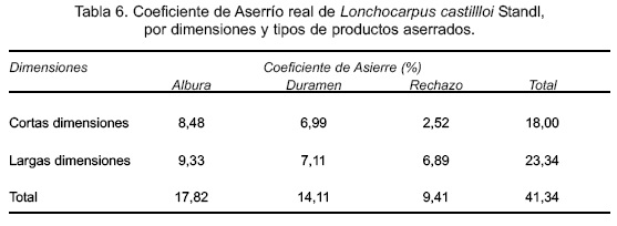 El coeficiente de aserrío real total fue de 41,3%, del cual 17,8% correspondió a madera de albura, 14,1% a madera de duramen y 9,41% a madera de rechazo.