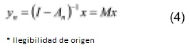 La ecuación 3 muestra que el vector de ingresos endógenos se representa como una suma de dos términos, el primero son las transacciones entre las cuentas endógenas y el segundo las inyecciones desde las cuentas exógenas a las endógenas. Los multiplicadores contables del modelo lineal pueden obtenerse reordenando con algebra matricial la ecuación anterior: