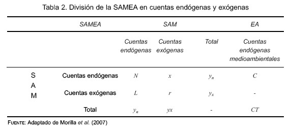 Es muy importante conocer cómo políticas públicas o shocks podrían afectar el crecimiento económico y el medio ambiente, es por eso que se recurre a los análisis de multiplicadores con una SAMEA, los cuales dan cuenta del efecto que tienen los shocks externos sobre la economía y el medioambiente. Para ello hay que definir las cuentas que pertenecen a exógenas y endógenas, como se presenta en la tabla 2.