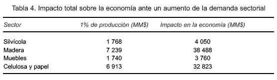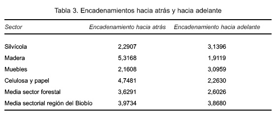 En la tabla 3 se observa el encadenamiento hacia atrás de los subsectores forestales de la región del Biobío. Los subsectores de muebles (2,16) y silvicultura (2,29) están bajo la media, mientras los subsectores celulosa y papel (4,75) e industria de la madera (5,32) están sobre la media. Así, este último subsector forestal, a través de su demanda de insumos, es capaz de transmitir más fuertemente los beneficios de cualquier incremento en su demanda final al resto de los sectores de la economía. En la tabla 3 también se observa el encadenamiento hacia adelante, concluyéndose que los sectores que incrementarían más fuertemente su producción ante un aumento en la demanda final de toda la economía serían en orden decreciente, la silvicultura (3,14), muebles (3,10), celulosa y papel (2,26) y la industria de la madera (1,91).
