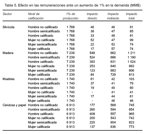 Tal como se aprecia en la tabla 5 si ocurre un shock de demanda en el sector de la primera columna equivalente a 1% de su producción, representado en la tercera columna, para cada tipo de mano de obra (segunda columna) se provocaría un incremento directo sobre las remuneraciones por la mayor contratación en el sector, afectado por el alza inicial de la demanda (cuarta columna). Pero además, este sector demandaría insumos de otros sectores con los que tenga encadenamientos productivos. Esto elevaría, en una segunda ronda, las remuneraciones de los trabajadores de esos sectores. Esta demanda inducida se sigue repitiendo en sucesivas rondas y elevando nuevamente las remuneraciones, hasta que se alcanza la convergencia; por lo que a la suma de estos sucesivos efectos se les define como efectos indirectos (quinta columna), los cuales sumados al efecto directo arrojan el efecto final sobre las remuneraciones. A modo de ejemplo, si aumenta la demanda en la industria de la madera 1% (7 239 millones), la producción debe expandirse al contratar y pagar a la mano de obra no calificada masculina 548 millones de pesos por impacto directo. Pero además, los impactos a través de los encadenamientos productivos sobre el resto de los sectores económicos de la región (que también ven elevadas sus demandas, producciones y contrataciones de mano de obra de forma inducida) elevan adicionalmente el pago de remuneraciones para el nivel no calificado masculino en 662 millones de pesos. Por lo que el efecto total es de 1 211 millones de pesos.