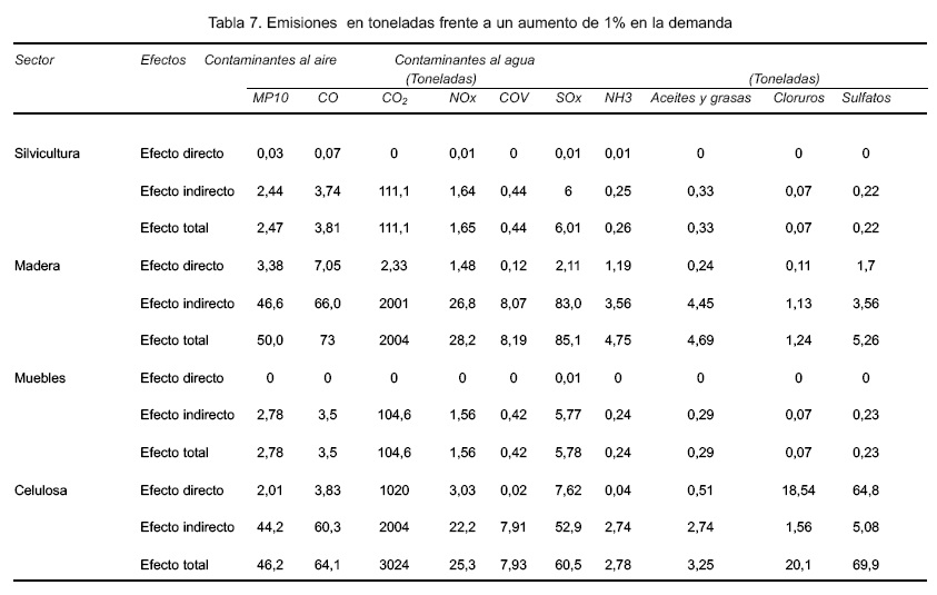 En la tabla 7 se presenta el efecto, según las emisiones en miles de toneladas, de un aumento de 1% en la demanda final de cada uno de los subsectores forestales de la región del Biobío. El efecto directo se produce por el incremento de las emisiones necesarias para elevar la producción ante el shock de demanda, pero el efecto indirecto se genera por el incremento en la actividad y emisiones inducidas en el resto de los sectores económicos de la región.