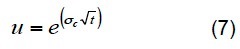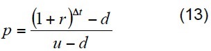 La proyección del precio de venta promedio de los subproductos forestales sigue un proceso estocástico del tipo Geométrico Browniano. Se trabajó en tiempo discreto y, para la elaboración de una rejilla binomial,6 se utilizaron los parámetros del modelo CRR (Cox et al., 1979) mediante las ecuaciones (7) y (8).
