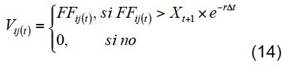 Donde r representa la tasa libre de riesgo y los movimientos (u; d), surgen de las ecuaciones (7) y (8) y Δt se definió en la ecuación (6). El valor esperado Vij(t) surgió de comparar en cada periodo, el valor correspondiente a cada nodo FFij(t) con el valor esperado en el próximo año; Xt+1 x e-rΔt matemáticamente el problema se resume en la expresión (14).