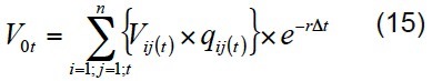 Siendo V0t el valor actual de la opción de talar en el momento t. El ejercicio de la opción en cada nodo (escenario) en t se expresa por Vij(t). La probabilidad de alcanzar el nodo asociado es q ij(t). El factor de actualización desde el momento (t) hasta el inicio (t = 0) es e-rΔt.