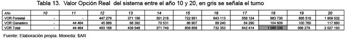 En este trabajo se plantea la necesidad de aplicar el enfoque de la VOR en el ejercicio de la tala en un sistema de producción mixto forestal-ganadero, comparando cada año, a partir del décimo (madurez tecnológica) hasta el vigésimo (máximo horizonte de planificación), el valor obtenido, producto de la cosecha en los nodos de la rejilla binomial (año t) versus el valor actual neto esperado de talar en el próximo año (año t+1). La comparación periodo a periodo es relevante porque estos valores se caracterizan por ser cambiantes en función del tiempo y riesgo de las variables. El caso de análisis se corresponde con un escenario forestal simulado y un nivel de producción ganadera acorde con el patrimonio forestal, el cual permitirá determinar la viabilidad económica del proyecto de inversión para el noreste de la República Argentina, mediante la aplicación de la VOR y la comparación con el VAN.