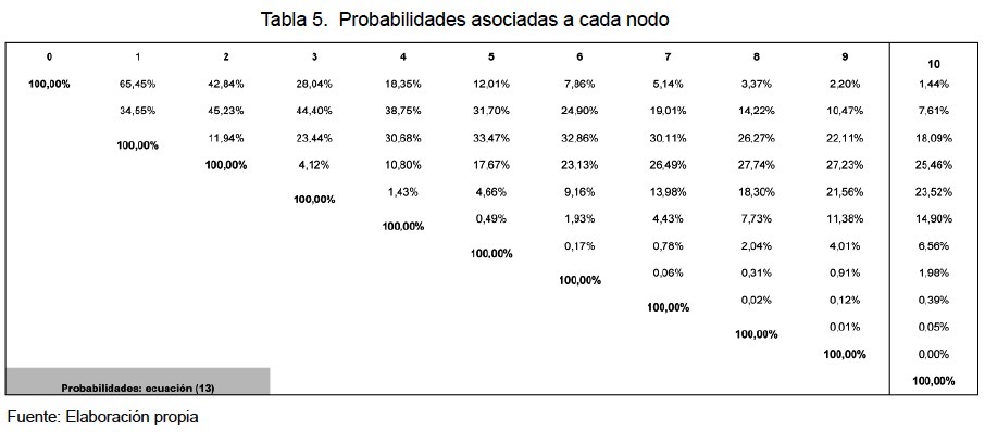 7 Los nodos pueden interpretarse como posibles escenarios futuros; a mayor intervalo de tiempo mayor cantidad de nodos debido a la mayor incertidumbre. Así, para el periodo t = 1 la cantidad de nodos de la rejilla es de 2 (dos escenarios) mientras que para t = 10 la cantidad es 11.