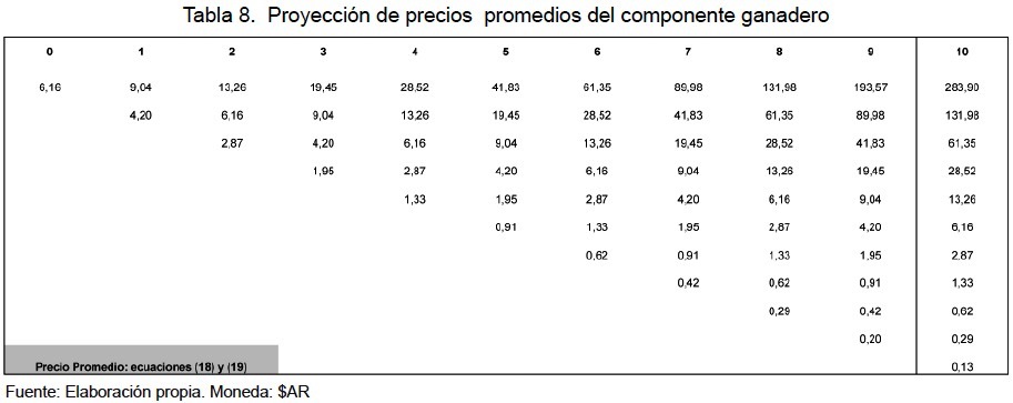 El precio promedio inicial surgió de aplicar la ecuación (1), arrojando un valor de $AR 189 por tonelada y aplicando la ecuación (17) un valor de $AR 6,16/kg de peso vivo para el periodo t = 0. Para el riesgo de precio forestal se aplicó la ecuación (2), utilizando cuatro series históricas de precios correspondientes a cuatro clases diamétricas;8 para el riesgo de precio ganadero se aplicó la ecuación (19), utilizando una serie de precios históricos de ganado en pie9, los valores obtenidos para la cartera de subproductos forestales (σs) fueron de 13,57% y 38,3% (σg) para el componente ganadero.