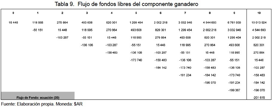 El análisis del componente ganadero fue análogo al del componente forestal. La particularidad de este componente es la generación de flujos de cajas anuales, donde hubo egresos por compra de terneros y costos de producción y un ingreso a los doce meses producto de la venta. El VAN se determinó con la ecuación (16)