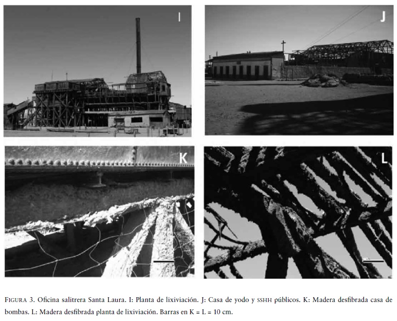 Con respecto al deterioro producido en las salitreras de Humberstone y Santa Laura, sin lugar a dudas, este se encuentra estrechamente ligado con el clima, los procesos industriales de fabricación del salitre y la acumulación de minerales salinos en los depósitos de nitratos chilenos, tales como: halitas, nitratos, sulfatos, yodatos, cromatos y boratos, entre otros, los que en conjunto han permitido, por muchos años, el transporte y acumulación de sales así como el posterior deterioro de las maderas constituyentes de las edificaciones. Estudios realizados por Bahamóndez y Villagrán (2009) señalan que el deterioro en las maderas fue producto de derrames de soluciones salinas en el proceso de producción del caliche, y cuya impregnación al interior de la madera junto con los constantes ciclos de secado y humidificación someterían a la madera a fuertes solicitaciones mecánicas a nivel microscópico. Estos autores agregan que daños similares, pero de menor profundidad, son atribuidos al denominado "shok térmico" debido a la exposición de algunos elementos a altas temperaturas. Blanchette et al. (2002) sostienen que los problemas de desfibrado resultan ser más serios en áreas protegidas de las lluvias lo que facilitaría la acumulación de sales. Sin embargo, para los sitios estudiados en el presente trabajo las mayores acumulaciones de sal y los mayores daños observados se encuentran al exterior y la zona geográfica no es afectada por lluvias. Farrell (2007) agrega que los daños pueden ocurrir rápidamente en lugares donde grandes concentraciones de sal están en contacto con madera húmeda, o muy lentamente cuando bajas concentraciones de sal son acumuladas en la madera después de la evaporación del agua. Estas situaciones fueron evidenciadas tanto en la torre de lixiviación como en los molinos primarios de la oficina salitrera de Santa Laura. De acuerdo con lo señalado por Bahamóndez y Villagrán (2009), la humedad presente se asocia con el fenómeno de camanchaca.