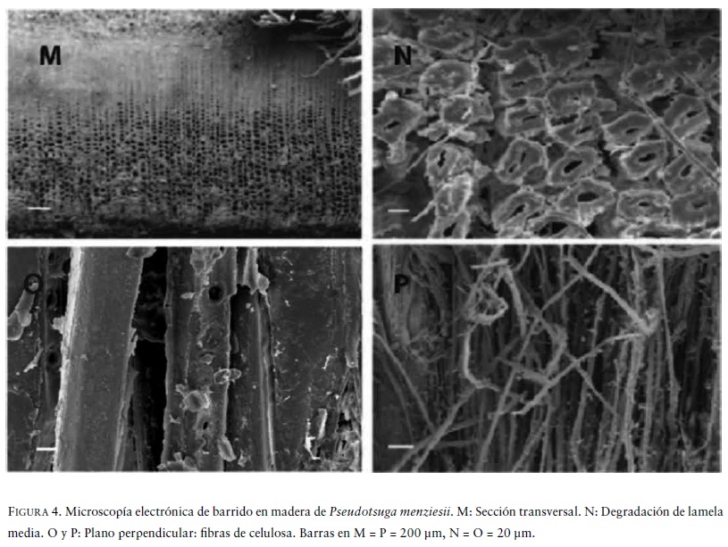 La figura 4 muestra las imágenes de microscopía electrónica de barrido (SEM) de madera correspondiente a la especie Pseudotsuga menziesii. Deformación de la sección transversal de las fibras y su separación resultan ser evidentes (Figs. 4M, 4N, 4O), lo que también puede ser observado en los planos perpendiculares de la muestra (Fig. 4P). Estos efectos son producidos debido a la degradación de la lamela media, exponiendo con total libertad las fibras celulósicas. Similar daño se observa en la figura 5 en madera correspondiente a la especie Nothofagus obliqua. Las imágenes permiten determinar, al igual que para la especie Pseudotsuga menziesii, deformación de la sección transversal de las fibras y degradación de la lamela media (Figs. 5Q, 5R, 5S, 5T).