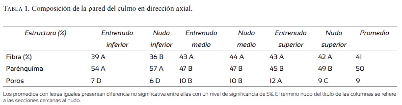 La proporción de los elementos constituyentes de la pared del culmo en dirección axial (inferior, media y superior) de secciones del entrenudo y cercanas al nudo se presentan en la tabla 1. En la tabla 2 se presentan las medidas de fibras de la sección interna, media y externa, del nudo y entrenudo, de la zona inferior, media y superior del culmo.