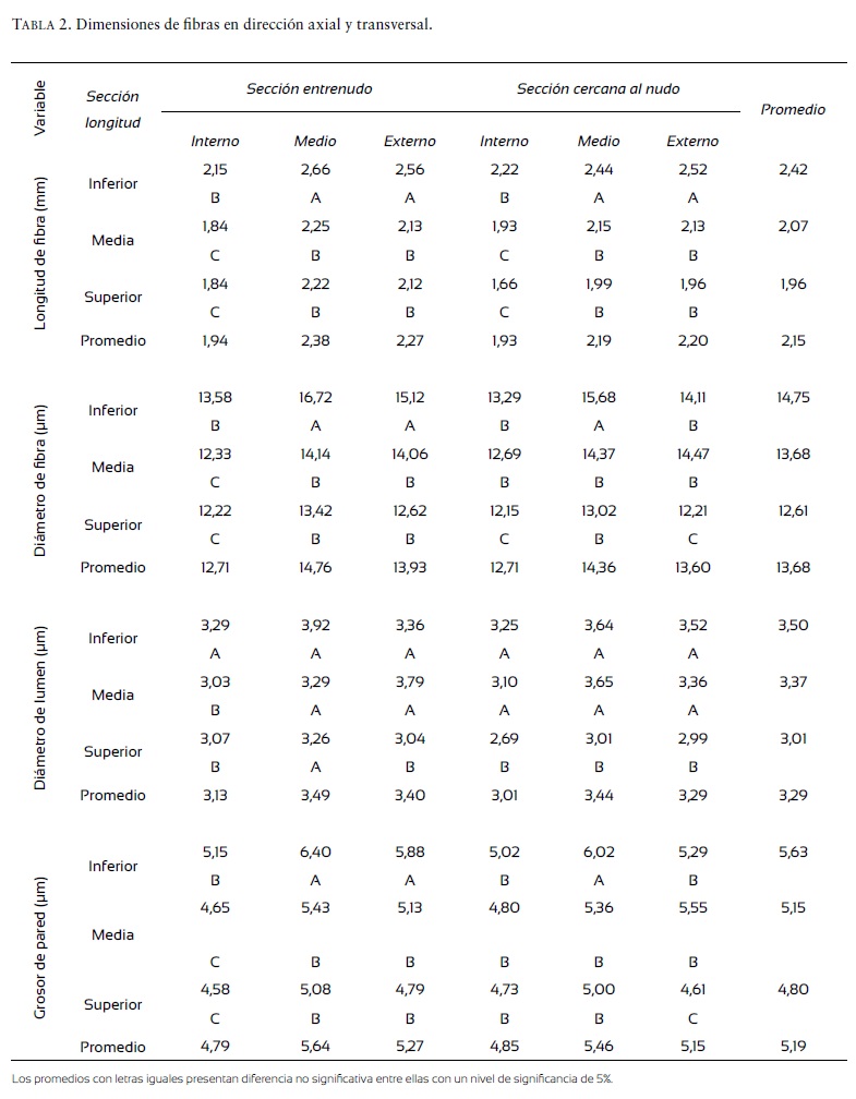 El grosor de pared de la fibra que se midió fue de 4,58 μm a 6,40 μm, similar al que se ha publicado para B. blumeana (5,2 μm - 6,1 μm) y B. vulgaris (3,29 μm - 7,10 μm) y menor al de G. levis (10 μm - 12 μm). En el entrenudo, se obtuvieron diferencias significativas entre las secciones exterior y media de la pared del culmo con la interna; en las secciones cercanas al nudo, estas diferencias se presentaron entre la sección interna con ambos lados en la parte inferior y entre la exterior con las media e interna de la parte superior (Espiloy, 1985; Sekyere, 1994; Ogunsile y Uwajeh, 2009; Wahab et al., 2009; Guimarães et al., 2010; Nordahlia et al., 2012).