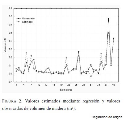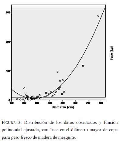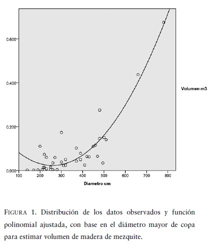 Con este modelo polinomial se obtuvo un coeficiente de determinación r2= 0,860. Este valor sugiere que es factible aplicar la ecuación para la estimación de volumen en árboles de mezquite de predios con características similares (Figs. 1 y 2).