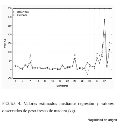 Para la variable de peso fresco de madera (Figs. 3 y 4), relacionada con el diámetro mayor de copa se obtuvo un coeficiente de determinación r2= 0,889 (Tabla 1), con la ecuación:
