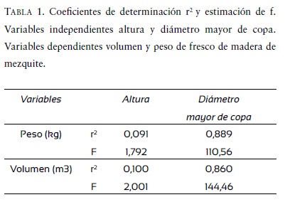 El diámetro de copa resultó ser la variable con mayor índice de correlación r2= 0,852 para volumen y para peso fresco de madera de mezquite con r2= 0,889.