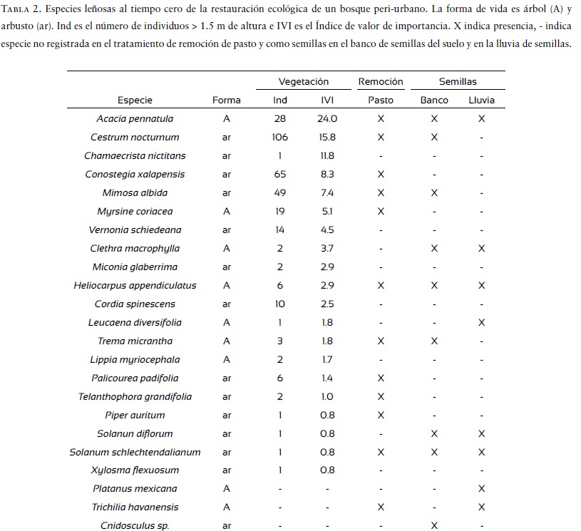 En cuanto a la composición de la vegetación, destaca que las mismas especies de árboles se encontraron en la vegetación inicial, en los experimentos de remoción de pasto y en el banco de semillas (Tabla 2, Apéndice 1). Algunas de esas especies pueden detonar una trayectoria sucesional una vez que disminuya la dominancia del pasto (Muñiz-Castro et al., 2012). Es notorio cómo la parcela con la menor dominancia de pasto (parcela 3), presenta la mayor riqueza y diversidad de formas de vida en su vegetación inicial. También es evidente que los árboles remanentes in situ funcionarán como núcleos de regeneración del bosque (Zahawi et al., 2013; Sandor y Chazdon, 2014). Para el caso de este estudio, el fragmento remanente de bosque, los árboles aislados y la vegetación riparia adyacente tienen una influencia en la composición de la vegetación registrada en las parcelas. Por ejemplo, la presencia de especies de bosque como Clethra macrophylla, Palicourea padifolia o Trichilia havanensis en las parcelas y banco de semillas se explica por la proximidad del fragmento de bosque rodeando el manantial, mientras que la presencia de Platanus mexicana en trampa de lluvias de semillas por la presencia de estos árboles en la vegetación riparia.