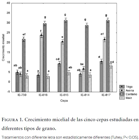En el experimento, el crecimiento micelial en los diferentes tipos de grano mostró diferencias significativas entre tratamientos (Tukey, P < 0.05), siendo el centeno (28.6 cm2) el de mayor crecimiento de todas las cepas analizadas, seguido de la avena (15.2 cm2), trigo (6.5 cm2) y maíz (4.5 cm2) (Fig. 1). Asimismo, la cepa con mayor respuesta entre tratamientos (Tukey, P < 0.05) fue la IE-817 (17.9 cm2) con respecto a las demás (IE-815=16.4 cm2; IE-816=14.9 cm2; IE-814=10.7 cm2 y IE-750=8.4 cm2). Por ello, se eligió el grano de centeno y la cepa IE-817 (M. conica) para la siguiente fase.
