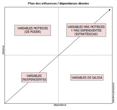 • Variables de poder: tienen alta motricidad y baja dependencia; son de las más importantes, y sobre ellas se debe actuar de inmediato en apoyo a las variables estratégicas.