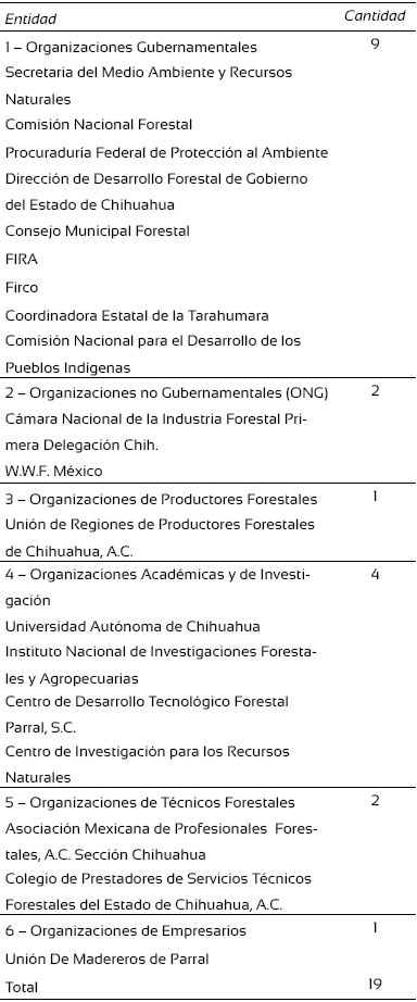 Se tomaron como base 19 entidades que constituyen los seis subsistemas del sistema de organización forestal (Tabla 1). Se realizó un censo, entrevistando a cada una de las entidades. Adicionalmente, para el análisis estructural del sistema, en cada subsistema se identificaron informantes clave. Las características que se buscaron en estos informantes clave fueron: ser representante o titular de una institución, tener trayectoria reconocida en el sector forestal del estado de Chihuahua, tener disponibilidad para proporcionar información, tener liderazgo, mostrar interés en el desarrollo forestal sustentable y ser experto en el sistema de organización forestal; de esta manera, se buscó proporcionar confiabilidad a la información obtenida.
