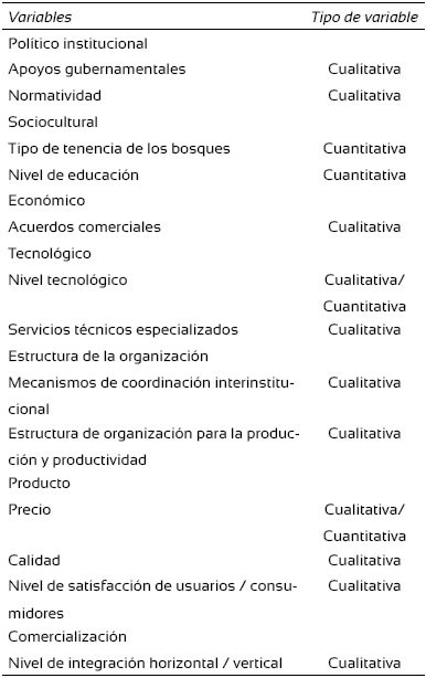 En la primera etapa, las variables consideradas fueron de naturaleza económica, tecnológica, cultural y social, entre otras (Tabla 2), y se tomó como base el marco político institucional, normativo y operacional en el cual funciona este sistema de organización forestal, como un factor clave para contribuir al ejercicio de la política forestal en el estado de Chihuahua. Adicionalmente, se consideró el resultado de aplicación de entrevistas estructuradas (Rojas, 2002), lo que permitió determinar fortalezas, oportunidades, debilidades y amenazas del sector forestal, así como el futuro más deseable para el sistema de organización. Lo anterior sirvió de base para la construcción de la Visión 2022 con las aportaciones y opiniones de los informantes clave. Por lo tanto, el diagnóstico permitió identificar la situación real del funcionamiento del sistema de organización forestal y la influencia de factores externos en el mismo.