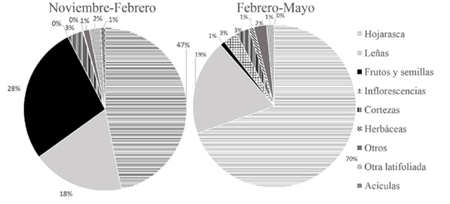 La hojarasca fue el material que más se incorporó en ambos trimestres. En noviembre-febrero los frutos representaron el segundo mayor aporte (Fig. 3), pero durante febrero-mayo destacaron las leñas.