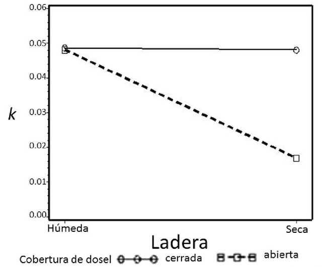 En las tasas de descomposición de combustibles con 1 h TR, no se hallaron diferencias significativas para ninguno de los factores estudiados, ni para su interacción. En el caso de los materiales con 10 h TR, no se hallaron diferencias significativas por ladera ni cobertura forestal, pero sí para la interacción ladera*cubierta (P = 0.0338). Aquí se consideró como covariable el diámetro de los materiales leñosos, pero no resultó significativo (P = 0.0574). Dicha interacción dejó ver que bajo dosel cerrado no hubo efecto de la ladera en la k, pero bajo dosel abierto resultó mayor la k en la ladera húmeda (Tabla 7 y Fig. 4).