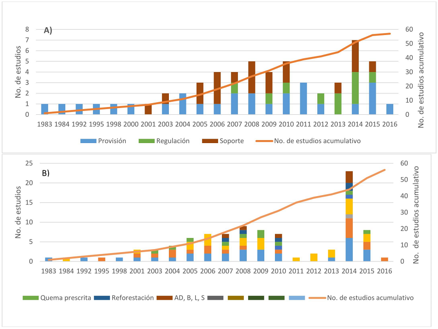 De la revisión realizada, se recopilaron 57 publicaciones. Por servicio ecosistémico, los manuscritos se distribuyeron en provisión de madera (42% del total), conservación de la diversidad vegetal (35%), almacenamiento y secuestro de carbono (18%) y regulación de flujos de agua (5%). Las prácticas silvícolas estudiadas incluyeron corta de árboles padre (AP), aclareo (ACL), corta de selección (CS), corta de matarrasa o corta total (CT), quema prescrita (QP), barbecho (B), acomodo de desperdicios (AD), siembra directa (S), reforestación con planta (REF) y limpia (L). Las prácticas silvícolas mejor estudiadas (90% de las investigaciones) fueron AP, CS, ACL y QP (Tabla 1). Los trabajos publicados en revistas y medios de difusión, destacaron en cantidad a partir del año 2003 (Fig. 1).