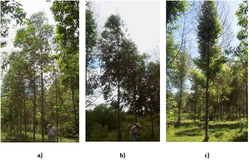 Figura 1 Clases de daño por heladas en árboles según escala visual: a) copa sana, sin daño aparente por heladas, b) ápice seco, resto de la copa sin daño por heladas, c) copa totalmente seca, rebrotando algunas ramas o el fuste.