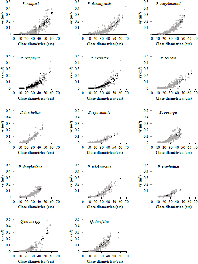 Los resultados obtenidos ajustando una ecuación por especie son considerablemente buenos (Tabla 2), con valores de REMC que oscilaron entre 0.012 m3 (P. ayacahuite) y 0.0427 m3 (P. cooperi), es decir, entre 5.52 kg y 19.64 kg de biomasa, respectivamente, valores de REMC cercanos, e incluso más bajos, a los encontrados por Bouriaud et al. (2013) (17.8 kg de biomasa para Picea abies y 19 kg para Fagus sylvatica), obtenidos del ajuste de un modelo que incluye el diámetro normal y la altura total como variables independientes. Por otra parte, los valores de ( Radj2 fueron aceptables (desde 0.645 para P. oocarpa, hasta 0.878 para P. engelmannii). Los valores más bajos de ( Radj2 se deben, en parte, a la gran dispersión que presenta el volumen de residuos para una misma categoría diamétrica por especie (Fig. 2); además, la arquitectura y forma de la copa está altamente influenciada por la densidad de la masa, variable que no fue considerada en este estudio.