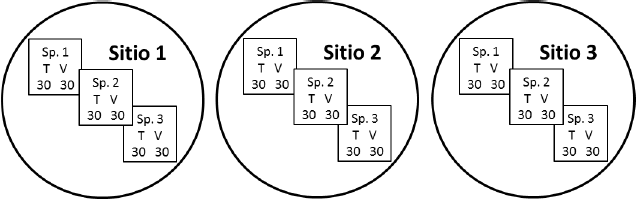 El ensayo de enriquecimiento fue de 540 plantas (270 por técnica), las cuales fueron distribuidas y sembradas en tres diferentes cachichinales (180 plántulas por sitio). Con la finalidad de identificar las diferencias en supervivencia y crecimiento, según la técnica experimental, las plantas fueron dispuestas en un diseño por pares, con 50 cm de separación entre sí y conservando la misma altura con respecto a la pendiente; es decir, dos plantas de la misma especie, introducidas a campo en la misma fecha pero cada una mediante una técnica distinta, creciendo bajo las mismas condiciones ambientales, de cobertura, tipo de suelo y pendiente (Fig. 2).