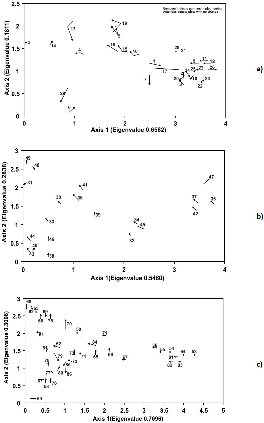 We conducted Detrended Correspondence Analysis, DCA (Hill & Gauch, 1980), as a measure of successional rate of change as well as to portray successional trajectories over time using plot´s species dominance as a metric. We used arrows connecting subsequent years of resampling to analyse the direction of successional changes. Vector DCA diagrams displayed the resultant displacement of a permanent plot from one forest inventory to another, where vector length represents successional rates of change in the ordination space (Whittaker, 1991).