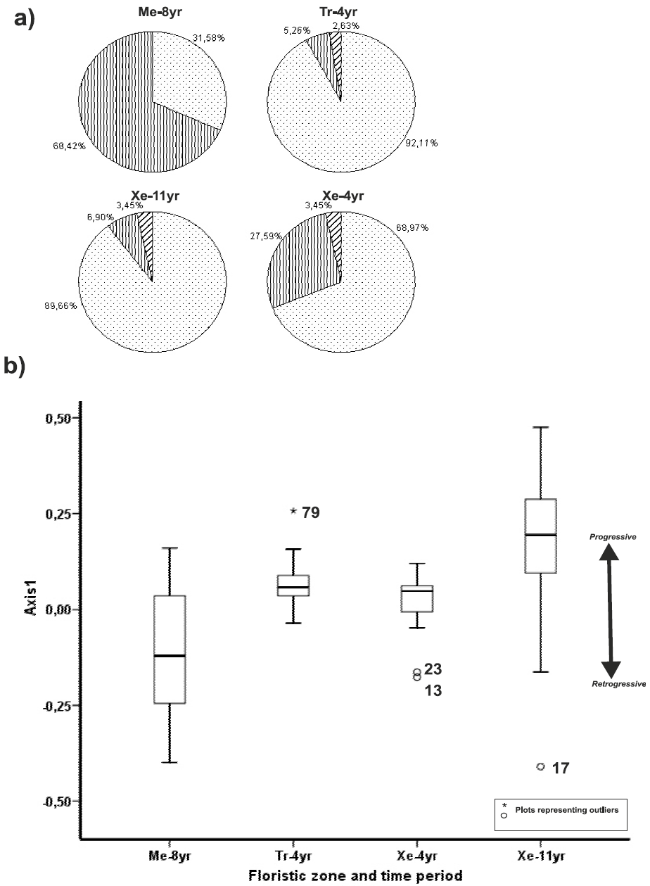 The rate of change magnitude was variable depending on the zone. Tr and Xe (comparing the same four-yr period along axis 1) showed that more plots experienced progressive than retrogressive successional changes, while a few remained unchanged; on the contrary for the Me, most of the plots performed retrogressive changes (Fig. 2 a-b). The median varied in the three zones but, regarding the amplitude of the changes, Me, with an eight-yr interval, was more similar to Xe at 11-yr interval; Tr and Xe were more similar at the same time interval of four-yr; the maximum progressive values corresponded to Xe at the higher time interval (11-yr) while the minimum was for Me (Fig. 2b).