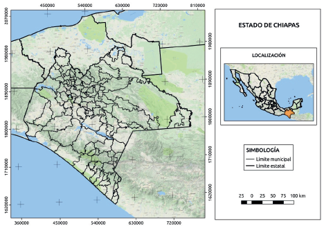 El estado de Chiapas se encuentra situado en el sureste de la República Mexicana, ocupando una superficie de 73 611 km2, lo que constituye 3.7% de la superficie nacional (Fig. 1). Chiapas, con su topografía accidentada, variedad de climas e intervalo altitudinal, es poseedor de una de las más grandes riquezas biológicas de México. Su riqueza florística incluye cerca de 10 000 especies de plantas vasculares, la cual es solo superada en México por la de Oaxaca (Comisión Nacional para el Conocimiento y Uso de la Biodiversidad [Conabio], 2013). A su vez, el estado cuenta con grandes extensiones de selvas altas perennifolias (633503 ha), bosques mesófilos (231 777 ha) y manglares (43602 ha), los cuales acumulan altas cantidades de carbono tanto en su biomasa como en el suelo (Semahn, 2017).