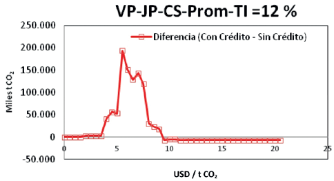 La figura 14muestra el efecto del crédito en los escenarios de mitigación para el caso de costos de oportunidad promedio positivos, con subsidio y TI = 12%.