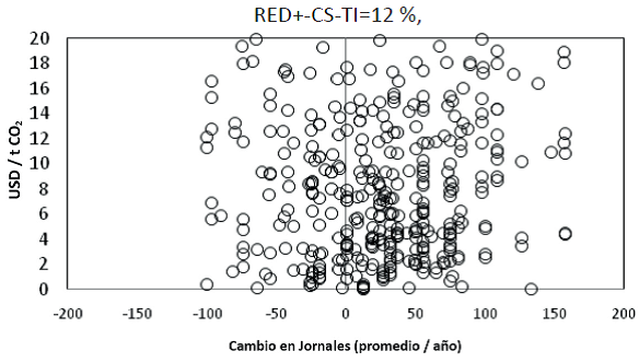 Este trabajo se centró en el análisis de costos de oportunidad positivos y negativos (White y Minang, 2011). Los costos de oportunidad negativos están asociados con la situación donde, reduciendo una actividad (emisiones), se generan ganancias netas y no costos. Las estimaciones de costos de oportunidad (USD/t CO2 -1 ha-1) fueron realizadas para los casos con subsidio y sin subsidio y, en cada uno de ellos, se evaluaron las situaciones de TI de 6%, 12% y 18%. El caso con subsidio y TI = 12% se considera como el normal o de referencia para los análisis de sensibilidad.