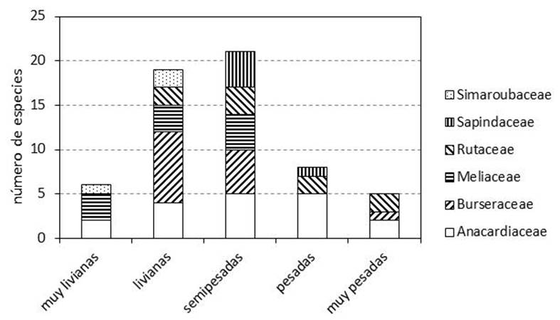 Figura 3 Abundancia relativa de las diferentes especies en cada familia por clase de densidad básica.