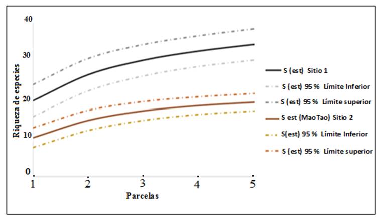 Cuando se analiza la riqueza de especies mediante las curvas de rarefacción basadas en el número de muestras (Fig. 1), como el número máximo es el mismo para cada encinar, las comparaciones se realizan en la asíntota. Como los intervalos de confianza de 95% para la riqueza promedio de especies no se sobreponen entre ambas áreas, entonces existen diferencias significativas entre su riqueza.