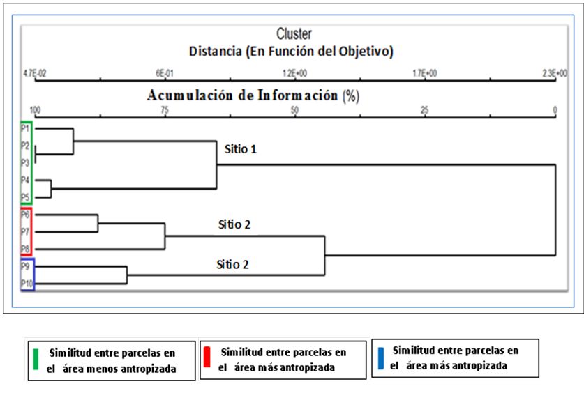 El comportamiento de la similitud de las parcelas en el área más antropizada, refleja la formación de dos grupos bien diferenciados. El primero, formado por las parcelas 6, 7 y 8 con más del 75% de similitud, se encuentra ubicado en la parte más plana de la meseta, alejado de la carretera, pero cerca de la comunidad rural nombrada “La Cuadra”, perteneciente al Consejo Popular Los Jazmines; en él se observa afectación por la tala de los árboles y el sobrepastoreo del ganado porcino, afectando considerablemente la composición y estructura del suelo como se mostró en párrafos anteriores, afectando el desarrollo de la regeneración natural del Q. cubana e influyendo en gran medida sobre la estructura y composición del ecosistema. El segundo grupo, igualmente con más de 75% de similitud, está integrado por las parcelas 9 y 10. Estas últimas parcelas se ubicaron en la parte más distante del asentamiento, coincidiendo con la parte más baja de la cuenca; esto lo hace un sitio muy difícil para la tala y acarreo de árboles, por lo que conserva un estrato arbóreo con buenos fenotipos, específicamente de encinos.