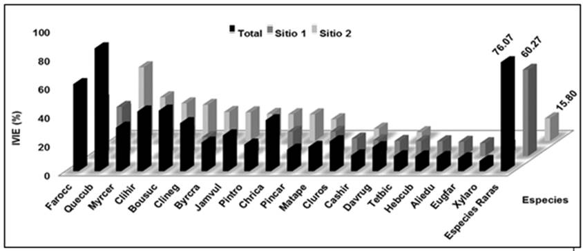 El comportamiento observado en el IVIE, respecto a la ubicación de F. occidentalis en la primera posición en importancia, se debe a la alta frecuencia y fundamentalmente a su elevada abundancia en el estrato herbáceo y arbustivo. La segunda posición ocupada por Q. cubana es el resultado de la cercanía del sitio 1 al asentamiento poblacional Los Jazmines: se encontraron evidencias de que los mejores fenotipos han sido talados para ser utilizados como horcones, para la construcción de viviendas y casas, y las ramas en la fabricación de instrumentos agrícolas como rastras para ser acarreadas por bueyes y para la fabricación de carbón vegetal o uso directo como leña, debido a su alto poder calorífico. Esta tala deja abierto el dosel, lo que favorece el crecimiento de las especies secundarias.