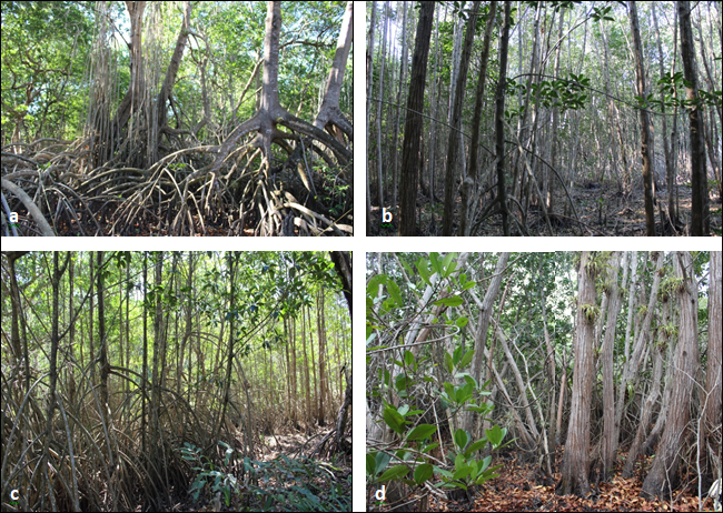 a) manglar monoespecífico de Rhizophora mangle; b) manglar monoespecífico de Laguncularia racemosa; c) manglar dominante de Rhizophora mangle; d) manglar dominante de Laguncularia racemosa.