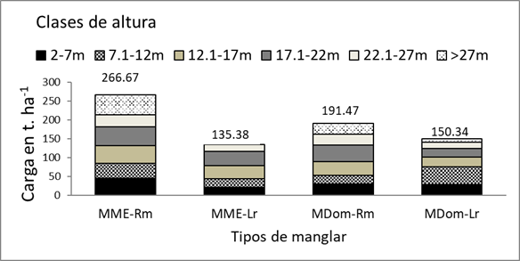 MME-Rm = manglar monoespecífico de Rhizophora mangle; MME-Lr = manglar monoespecífico de Laguncularia racemosa; MDom-Rm = manglar dominante de Rhizophora mangle; MDom-Lr = manglar dominante de Laguncularia racemosa. Los datos indican valor promedio + desviación estándar, en t ha-1. Letras diferentes indican diferencias significativas (p < 0.05).